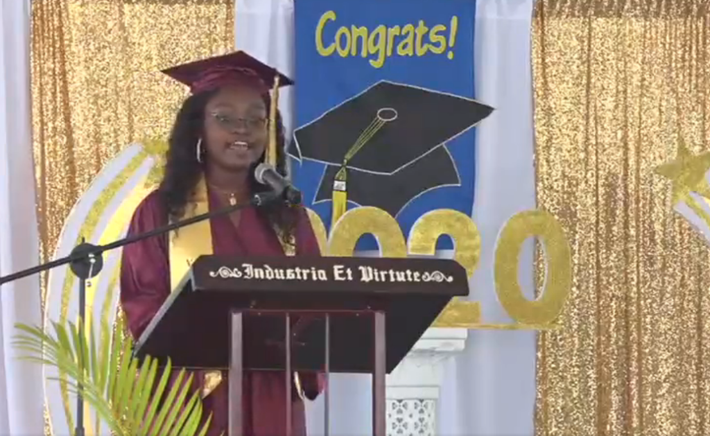 The 2020 Valedictorian of the Nevis Sixth Form College, Miss. Ercha Stapleton who, during her speech, reflected on group efforts made by her and her fellow graduates leading up to their exams: