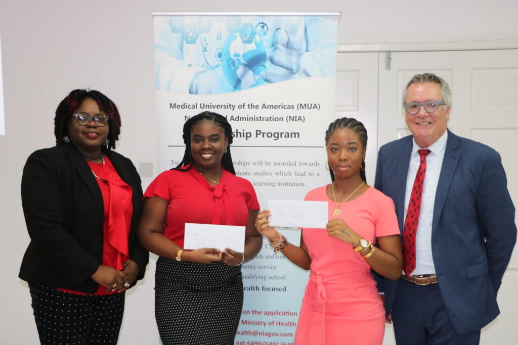 Ms. Dhakiya Liburd and Ms. Asher Walters-Hanley were on Friday, July 30th, presented with Scholarships sponsored by the Medical University of the Americas and Nevis Island Administration to pursue undergraduate degrees at regional universities.