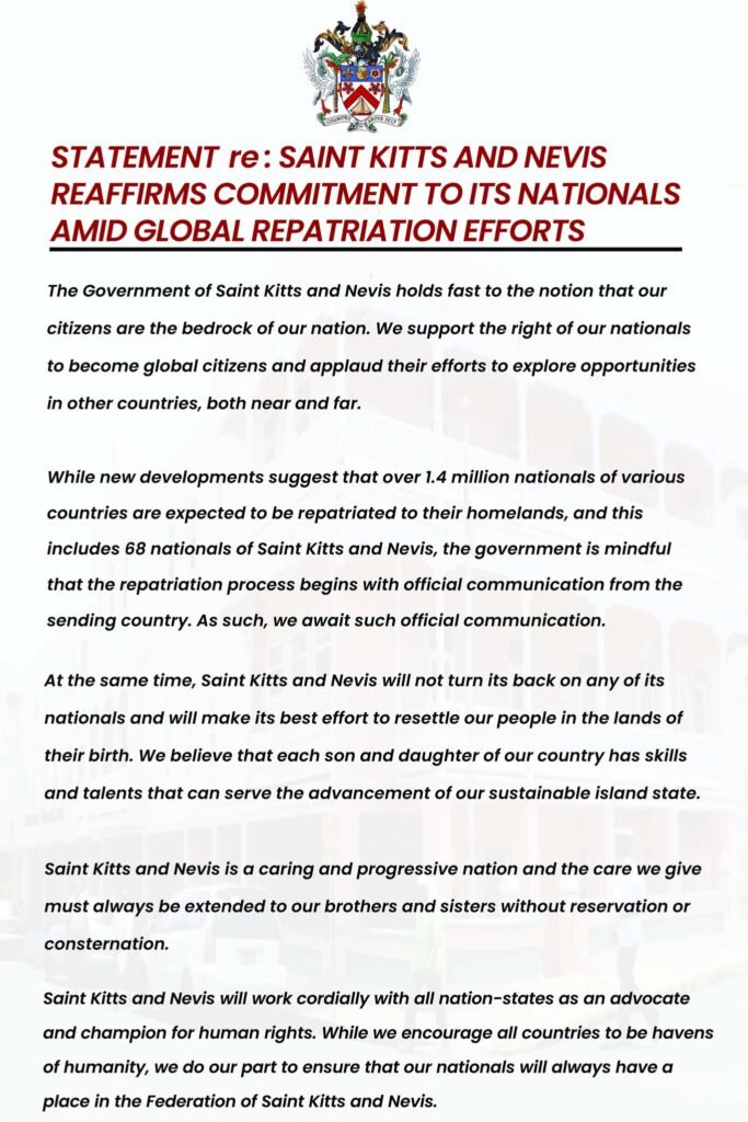 Following the US government’s announcement of conducting mass deportations for non-citizens in the USA, the Government of St. Kitts & Nevis (or the federal government) said in a press release on Wednesday Jan. 29th, that it “holds fast to the notion that our citizens are the bedrock of our nation” and the government “support the right of our nationals to become global citizens.”