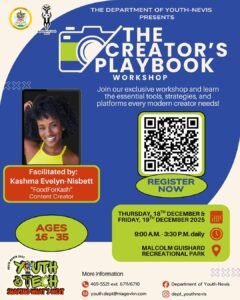 The Department of Youth on Nevis will host The Creator’s Playbook Workshop, a two-day training, aimed at youth ages 16 to 35, designed to equip young people with the skills needed to thrive in today’s digital landscape.