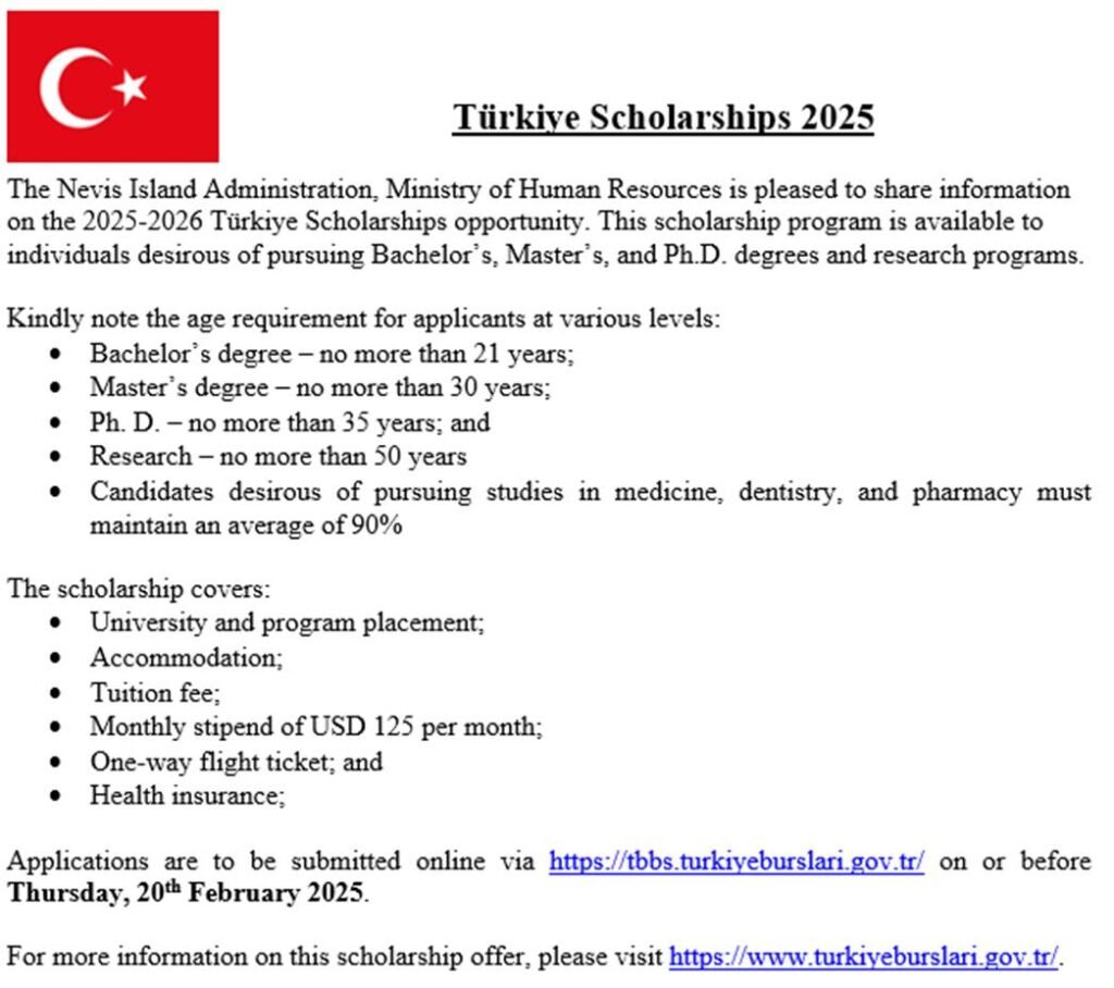 The Ministry of Human Resources within the Nevis Island Administration (NIA), has issued a notice about the 2025-2026 Republic of Turkey Scholarship opportunity.