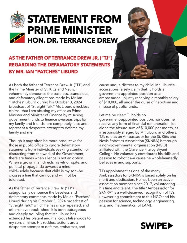 PM Drew said in his statement, “as both the father of Terrance Drew Jr. (“TJ”) and the Prime Minister of St. Kitts and Nevis, I vehemently denounce the baseless, scandalous, and defamatory allegations. Mr. Liburd’s reckless claims—that I am abusing my office as Prime Minister and Minister of Finance by misusing government funds to finance overseas trips for my family—are completely false.”