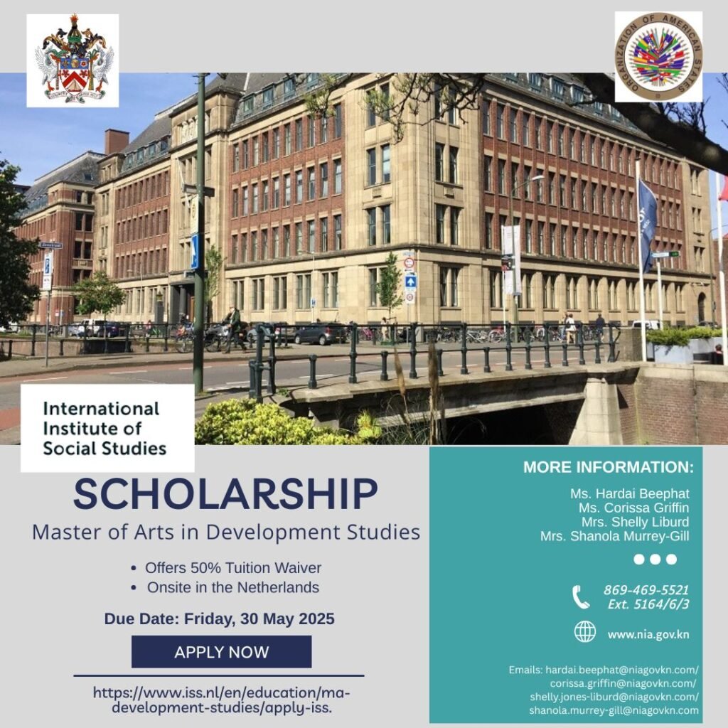 The Government of Saint Kitts and Nevis and the Organization of the American States is accepting scholarship applications for qualified individuals to study at the International Institute of Social Studies located at The Hague, in the Netherlands.