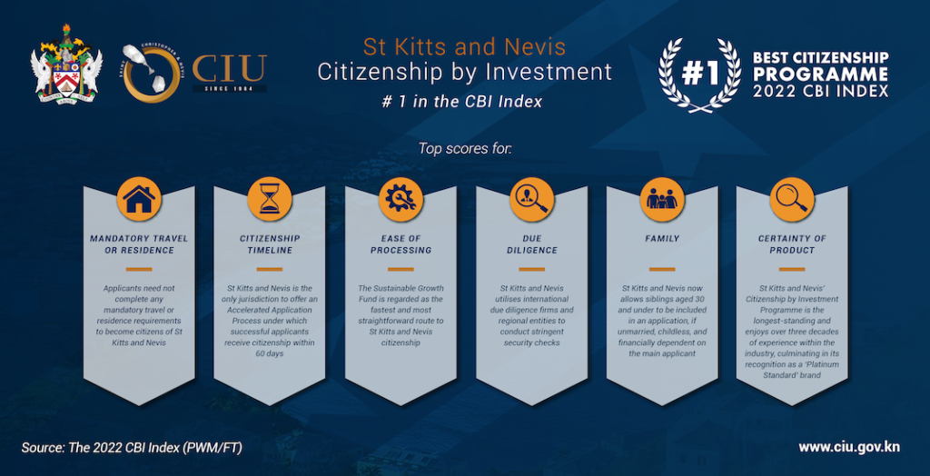 In evaluating the countries involved in the CBI program, CBIindex.com sites the benefits of St. Kitts and Nevis’ CBI program of requiring no travel or residence requirements, no interview requirement, no language or culture test, fast processing, with an Accelerated Application Process.