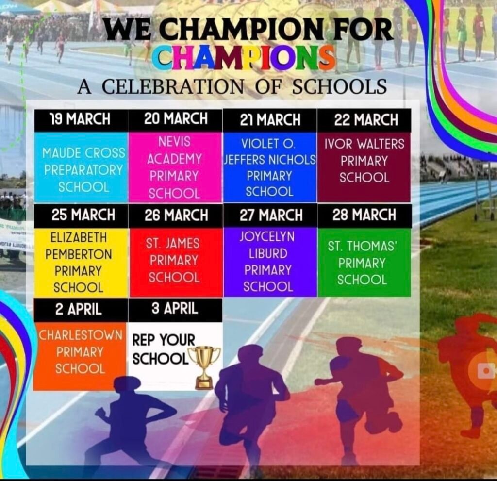 The initiative will run in the order of the schools’ placement in the championship last year, which started on Tuesday with baby blue for Maude Crosse Preparatory, pink on March 20th for Nevis Academy, blue on the 21st for VOJN, maroon on March 22nd for Ivor Walters, yellow on March 25th for Elizabeth Pemberton, red on the 26th for St. James, purple on the 27th for Jocelyn Liburd, green on the 28th for St. Thomas’ Primary and orange on April 2nd, for the Charlestown Primary School. Persons are then encouraged to wear the color of the school they support on the day of the championship, April 3rd.